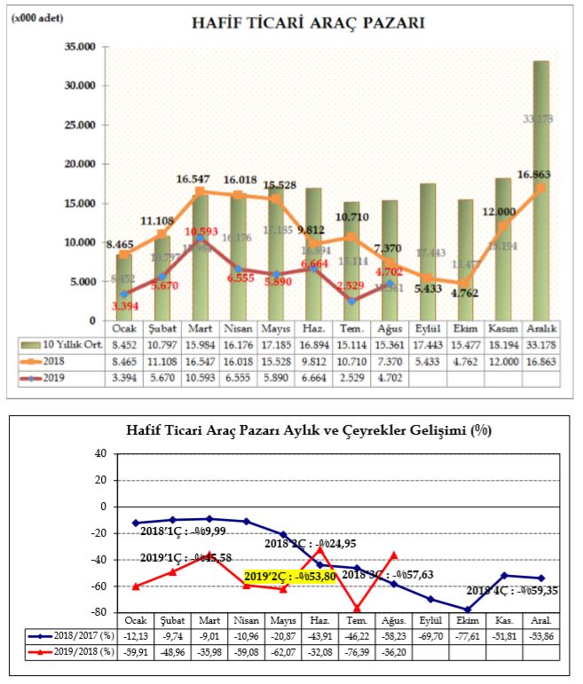 Hafif ticari araç pazarı, 2019 yılı Ocak-Ağustos döneminde geçen yıla göre %51,86 azalarak 45.997 adet oldu. 2018 yılı aynı dönemde 95.558 adet satış gerçekleşmişti.
