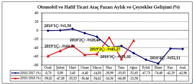 Türkiye otomobil ve hafif ticari araç toplam pazarı, 2019 yılı ilk sekiz ayında bir önceki yılın aynı dönemine göre %45,66 azalarak 239.317 adet olarak gerçekleşti. 2018 yılı ilk sekiz ayında 440.428 adet toplam pazar gerçekleşmişti.