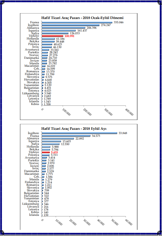 AB (28) ve EFTA ülkeleri toplamına göre hafif ticari araç pazarı 2018 Ocak-Eylül döneminde %3,4 arttı ve 1.582.819 adede yükseldi. 2017 yılının aynı döneminde 1.530.224 adet satış gerçekleşmişti. AB (28) ve EFTA ülkeleri toplamına göre 2018 Ocak-Eylül döneminde en fazla düşüş %7,7 ile Danimarka’da, %3,3 ile İzlanda’da ve %3,0 ile İngiltere’de yaşandı. 2018 yılı Ocak-Eylül döneminde, 2017 yılı aynı dönemine göre satışlarını en çok artıran ilk üç pazar sıralamasında; Macaristan %20,4, Slovakya %16,6 ve Letonya %16,2 oranlarıyla yer aldı. AB (28) ve EFTA ülkeleri toplamına göre hafif ticari araç pazarı 2018 Eylül ayında %5,8 azaldı ve 183.299 adede düştü. 2017 Eylül ayında 194.622 adet satış gerçekleşmişti. AB (28) ve EFTA ülkeleri toplamına göre 2018 Eylül ayında en fazla düşüş %45,4 ile İsveç’te, %29,2 ile Romanya’da ve %23,7 ile Litvanya’da yaşandı. 2018 Eylül ayında, 2017 yılı aynı ayına göre satışlarını en çok artıran ilk üç pazar sıralamasında; Slovenya %16,9, Macaristan %13,9 ve Polonya %8,1 oranlarıyla yer aldı.