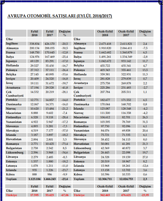 AB (28) ve EFTA ülkeleri toplamına göre otomobil pazarı 2018 Ocak-Eylül döneminde 2017 yılı aynı dönemine göre %2,3 arttı ve toplam 12.304.711 adet seviyesinde pazara ulaşıldı. 2017 yılı aynı döneminde 12.024.753 adet satış gerçekleşmişti. AB (28) ve EFTA ülkeleri toplamına göre 2018 yılı Ocak-Eylül döneminde geçen yılın aynı dönemine göre en fazla düşüş sırasıyla %12,6 ile İzlanda’da, %7,5 ile İngiltere’de ve %4,2 ile İrlanda’da görüldü. 2018 yılı Ocak-Eylül döneminde, 2017 yılı aynı dönemine göre satışlarını en çok artıran ilk üç pazar sıralamasında; Romanya %31,5, Litvanya %27,0 ve Macaristan %26,5 oranlarıyla yer aldı. AB (28) ve EFTA ülkeleri toplamına göre otomobil pazarı 2018 Eylül ayında 2017 yılının aynı ayına göre %23,4 azaldı ve toplam 1.123.184 adet seviyesinde pazara ulaşıldı. 2017 yılında 1.466.243 adet satış gerçekleşmişti. AB (28) ve EFTA ülkeleri toplamına göre 2018 Eylül ayında geçen yılın aynı ayına göre en fazla düşüş %73,4 ile Romanya’da, %41,8 ile Avusturya’da ve %39,7 ile İsveç’te görüldü. 2018 Eylül ayında, 2017 yılı aynı ayına göre satışlarını en çok artıran pazarlar arasında; Bulgaristan %8,5 ve Hırvatistan %3,3 oranlarıyla yer aldı