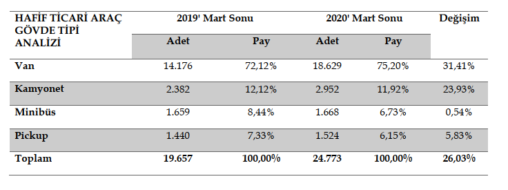 2020 yılı Mart sonunda Hafif Ticari Araç Pazarı gövde tipine göre değerlendirildiğinde, en yüksek satış adetine %75,20 pay ile Van (18.629 adet), ardından %11,92 pay ile Kamyonet (2.952 adet), %6,73 pay ile Minibüs (1.668 adet) ve %6,15 pay ile Pick-up (1.524 adet) yer aldı.