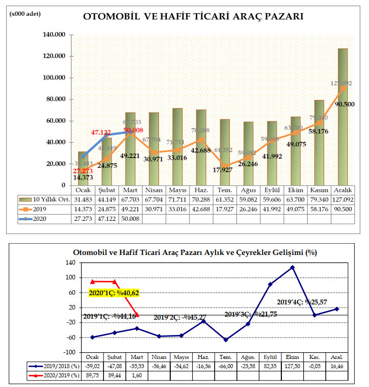 Türkiye otomobil ve hafif ticari araç toplam pazarı, 2020 yılı Mart sonunda bir önceki yılın aynı dönemine göre %40,62 artarak 124.403 adet olarak gerçekleşti. 2019 yılı üç aylık dönemde 88.469 adet toplam pazar gerçekleşmişti.