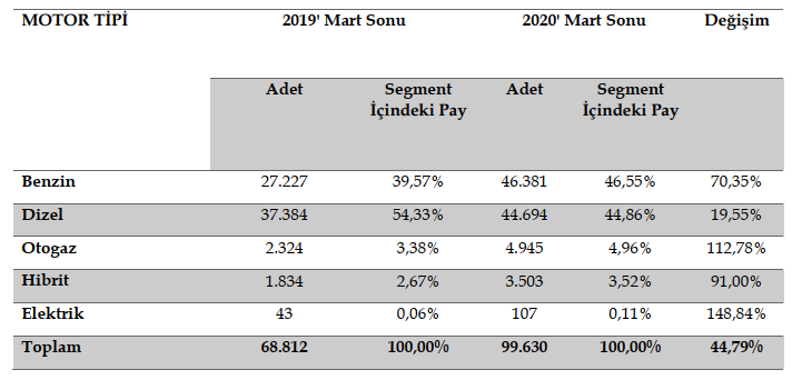 2020 yıl Mart ayı sonunda otomobil satışları motor tipine göre incelendiğinde benzinli otomobil satışları %46,55 pay (46.381 adet) ile birinci sırada yer alırken, dizel otomobil satışları %44,86 pay (44.694 adet) ile ikinci sırada, ardından otogazlı %4,96 pay ile üçüncü, hibrit %3,52 pay ile dördüncü ve elektrikli otomobiller ise 0,11 pay ile beşinci sırada yer aldı.