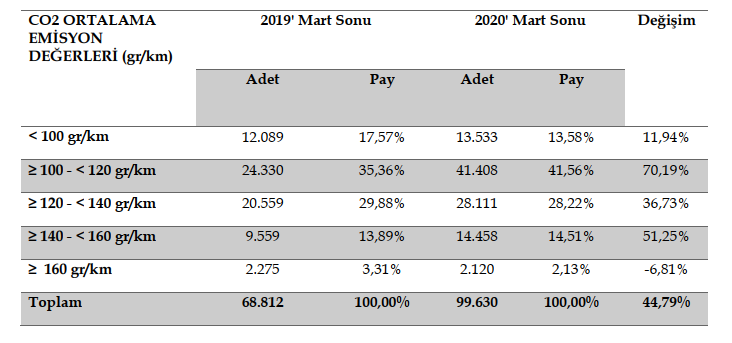 2020 Mart ayı sonunda otomobil pazarı ortalama emisyon değerlerine göre incelendiğinde, en yüksek paya %41,56 oranıyla 100-120 gr/km arasındaki otomobiller (41.408 adet) ve ardından %28,22 pay ile 120-140 gr/km arasındaki otomobiller (28.111 adet) sahip oldu.