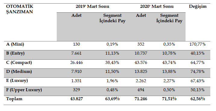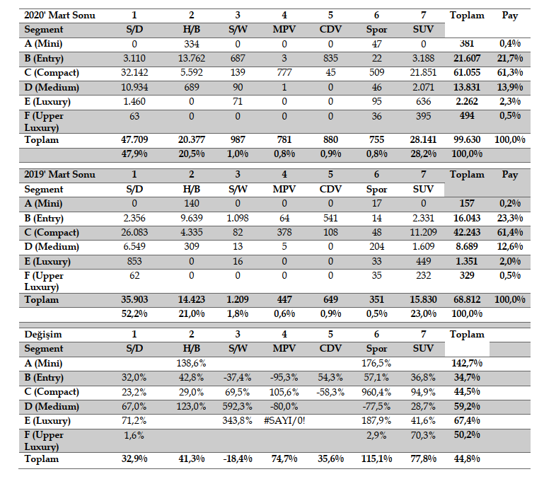 2020 yılı Mart sonunda otomobil pazarı segmentinin %83,4’ünü vergi oranları düşük olan A, B ve C segmentlerinde yer alan araçlar oluşturdu. Segmentlere göre değerlendirildiğinde, en