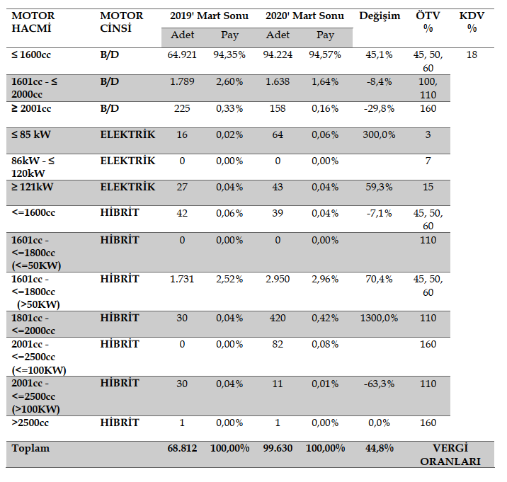 2020 Mart ayı sonunda otomobil pazarı motor hacmine göre incelendiğinde, en yüksek paya %94,57 oranıyla 1600cc altındaki otomobiller 94.224 adet ile sahip oldu. Ardından %1,64 pay ile 1600 2000cc aralığındaki otomobiller ve %0,16 pay ile 2000cc üstü otomobiller yer aldı. 2019 Mart sonuna göre, 1600cc altındaki otomobil satışları %45,1 oranında artarken , 1600-2000cc aralığında motor hacmine sahip otomobillerde%8,4 ve 2000cc üstü otomobillerde %29,8 oranında azalış görüldü. 2020 yılı ilk çeyreğinde 107 adet elektrikli, 3.503 adet hibrit otomobil satışı gerçekleşti.