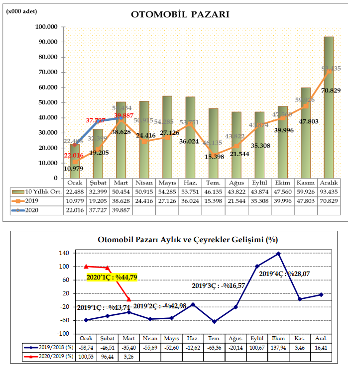 Türkiye Otomotiv pazarında otomobil satışları, 2020 ilk çeyreğinde geçen seneye göre %44,79 oranında artarak 99.630 adet oldu. Geçen yıl aynı dönemde 68.812 adet satış yaşanmıştı. 2020 yılı Mart ayında otomobil satışları bir önceki yılın aynı ayına göre %3,26 arttı ve 39.88 adet oldu. Geçen sene 38.628 adet satış gerçekleşmişti. Otomobil pazarı, 10 yıllık Mart ayı ortalama satışlara göre %20,94 azalış gösterdi.