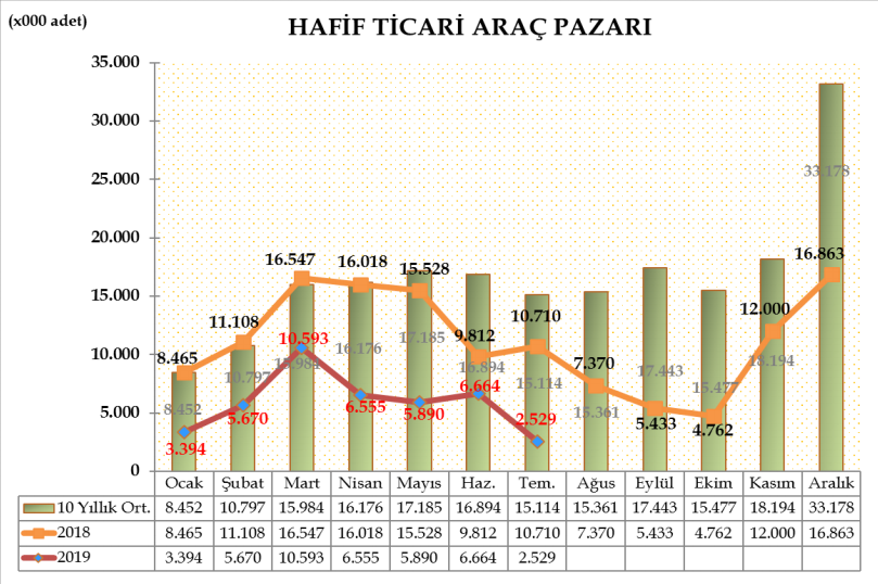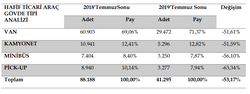 Hafif ticari araç pazarı, 2019 yılı Ocak-Temmuz döneminde geçen yıla göre %53,17 azalarak 41.295 adet oldu. 2018 yılı aynı dönemde 88.188 adet satış gerçekleşmişti.
