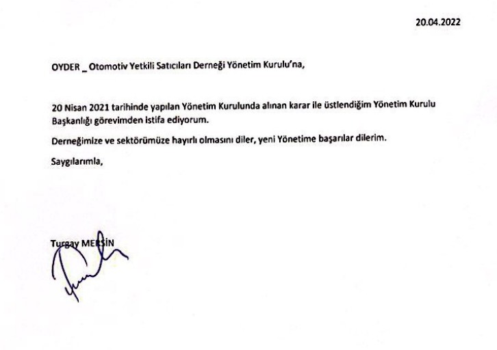 OYDER Başkanı Turgay Mersin istifa mektubu: