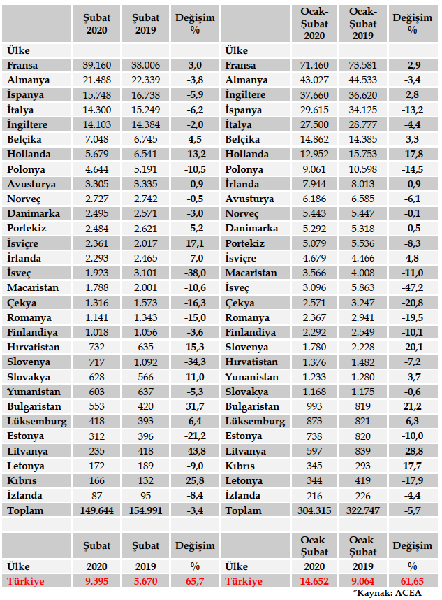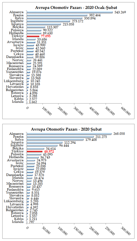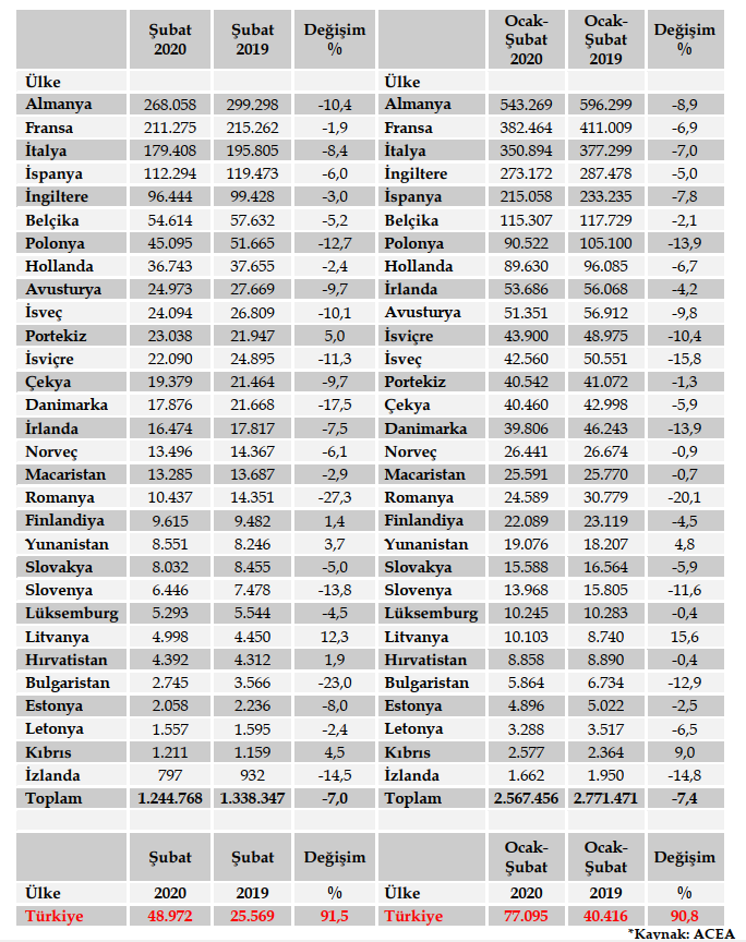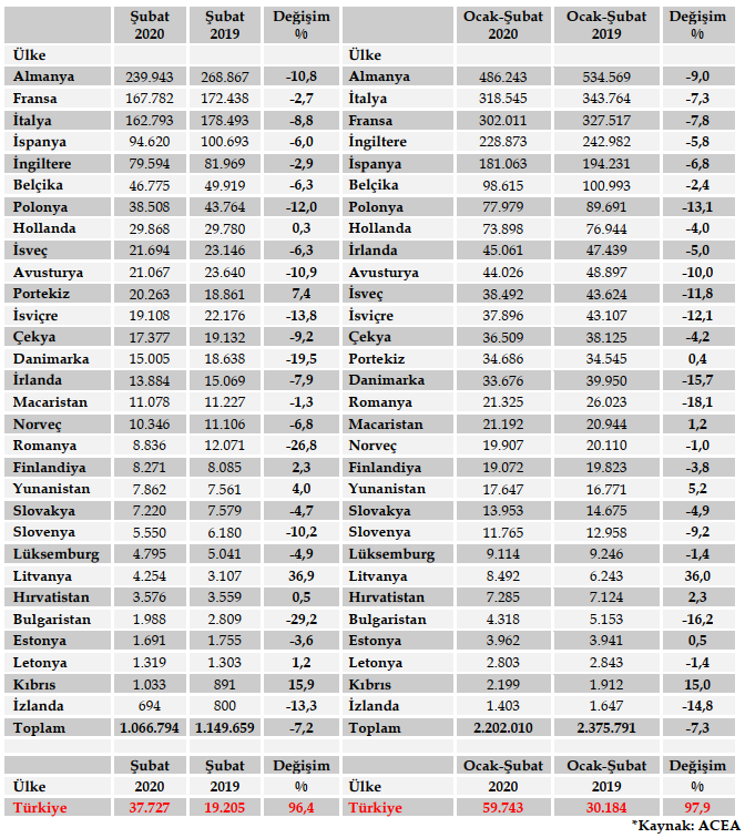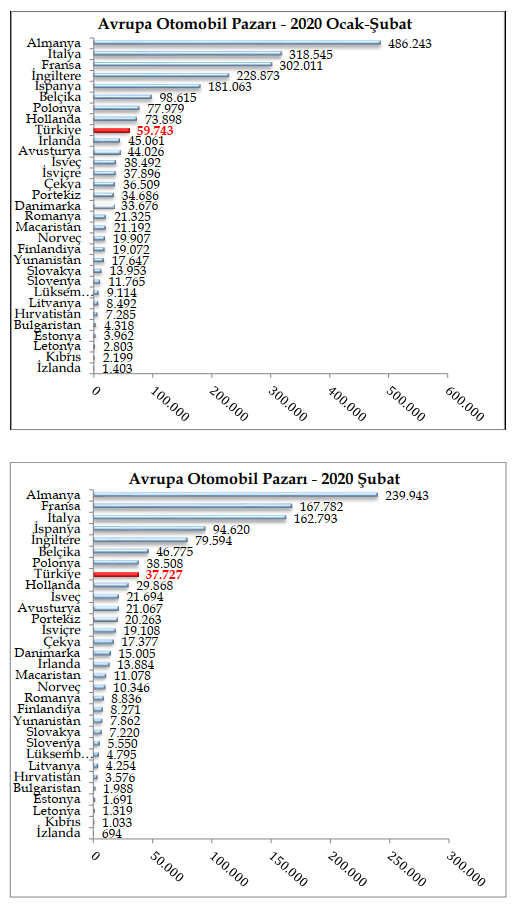 AB (28) ve EFTA ülkeleri toplamına göre otomobil pazarı 2020 Ocak-Şubat döneminde 2019 yılı aynı dönemine göre %7,3 azaldı ve toplam 2.202.010 adet seviyesinde pazara ulaşıldı. 2019 yılı aynı döneminde 2.375.791 adet satış gerçekleşmişti. AB (28) ve EFTA ülkeleri toplamına göre 2020 yılı Ocak-Şubat döneminde geçen yılın aynı dönemine göre en fazla düşüş sırasıyla %18,1 ile Romanya, %16,2 ile Bulgaristan, %15,7 ile Danimarka’da görüldü. 2020 yılı Ocak-Şubat döneminde, 2019 yılı aynı dönemine göre satışlarını en çok artıran ilk üç pazar sıralamasında Litvanya %36, Yunanistan %5,2 ve Hırvatistan %2,3 oranlarıyla yer aldı.