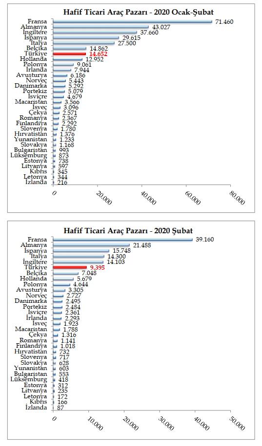 AB (28) ve EFTA ülkeleri toplamına göre hafif ticari araç pazarı 2020 Ocak-Şubat döneminde %5,7 azaldı ve 304.315 adede düştü. 2019 yılının aynı döneminde 322.747 adet satış gerçekleşmişti.