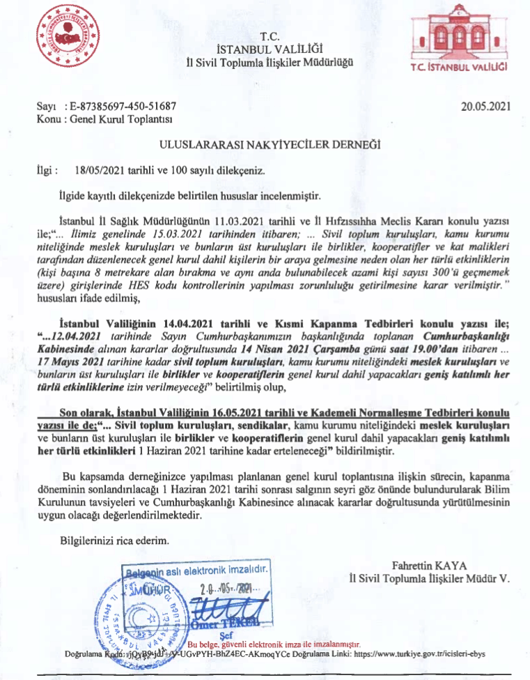 2 Haziran 2021 Çarşamba günü gerçekleşecek olan 40. Olağan Genel Kurul Toplantısı, İstanbul İl Sivil Toplumla İlişkiler Müdürlüğü’nün yazısı üzerine ertelendi.
