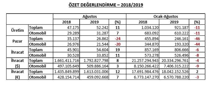 2019 yılı Ocak-Ağustos döneminde bir önceki yılın aynı dönemine göre, toplam otomotiv ihracatı adet bazında yüzde 6 oranında azalırken, otomobil ihracatı yüzde 8 oranında azaldı. Bu dönemde, toplam ihracat 806 bin 666 adet, otomobil ihracatı ise 526 bin 496 adet düzeyinde gerçekleşti. 2019 yılı Ocak-Ağustos döneminde bir önceki yılın aynı dönemine göre, toplam otomotiv ihracatı Dolar bazında yüzde 4 azalırken, Euro bazında ise geçen yılın aynı dönemine göre yüzde 2 arttı. Bu dönemde toplam otomotiv ihracatı 20,3 Milyar $ olarak gerçekleşirken, otomobil ihracatı yüzde 9 azalarak 7,4 Milyar $ seviyesinde gerçekleşti. Euro bazında otomobil ihracatı ise yüzde 3 azalarak 6,6 Milyar € seviyesinde gerçekleşti.
