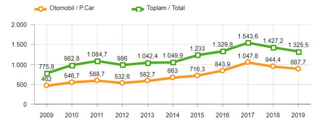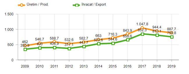 2019 yılı Ocak-Kasım döneminde toplam üretim yüzde 7 ve otomobil üretimi bir önceki yılın aynı dönemine göre yüzde 6 oranında azaldı. Bu dönemde, toplam üretim 1 milyon 325 bin 490 adet, otomobil üretimi ise 887 bin 651 adet düzeyinde gerçekleşti.
