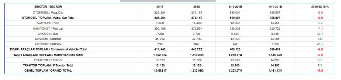 2019 yılı Ocak-Kasım döneminde toplam pazar geçen yılın aynı dönemine göre yüzde 29 azalarak 399 bin 77 adet düzeyinde gerçekleşti. Bu dönemde otomobil pazarı ise yüzde 26 oranında azaldı ve 316 bin 427 adet olarak gerçekleşti.