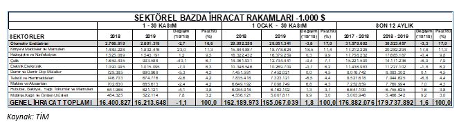 Uludağ İhracatçı Birlikleri (UİB) verilerine göre, 2019 yılı Ocak-Kasım döneminde toplam ihracat, 2018 yılına göre yüzde 4 oranında azaldı ve 28,6 milyar $ oldu. Euro bazında ise yüzde 2 artarak 25,6 milyar € olarak gerçekleşti.