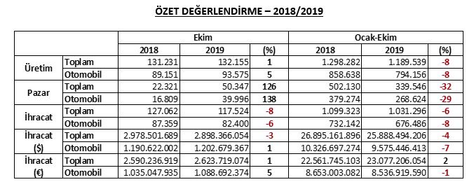 Otomotiv Sanayii Derneği’nin (OSD) 2019 yılı Ocak-Ekim dönemi verilerine göre, toplam üretim bir önceki yılın aynı dönemine kıyasla yüzde 8 azalarak 1 milyon 189 bin 539 adet, otomobil üretimi de yine yüzde 8 azalarak 794 bin 156 adet düzeyinde gerçekleşti. Bu dönemde toplam pazar, geçen yılın aynı dönemine göre yüzde 32, baz etkisi dikkate alındığında 2017 yılına göre yüzde 54 azalarak 339 bin 546 adet oldu. Ocak-Ekim döneminde ihracat ise, adet bazında yüzde 6 azalırken, otomobil ihracatı yüzde 8 oranında azaldı. Bu dönemde, toplam ihracat 1 milyon 31 bin 296 adet olurken, otomobil ihracatı 676 bin 486 adet düzeyinde gerçekleşti.