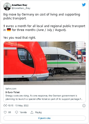 Ulaştırma Bakanı Volker Wissing parlamentoda verdiği demeçte, 'Şimdiye kadar toplu taşımaya daha az ilgi duyan birçok kişi, önümüzdeki 3 ay içinde toplu taşımaya bir şans vermek istiyor' dedi.