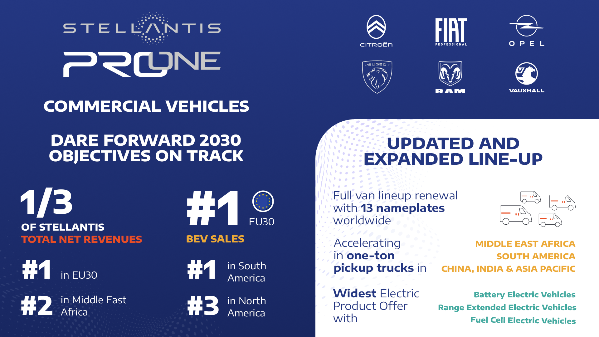 2023 yılında Stellantis’in net gelirlerinin üçte birini gerçekleştiren Stellantis Pro One, Avrupa 30 pazarında ve Güney Amerika’da pazar lideri oldu. Orta Doğu ve Afrika’da rekor pazar payına ulaşan Stellantis Pro One, 2023 yılında Kuzey Amerika ticari araç pazarında 2’nci sıraya yükseldi. Stellantis Pro One, Dare Forward 2030 kapsamında 2027 yılına kadar küresel lider olma hedefine ulaşmak için konumlanıyor.