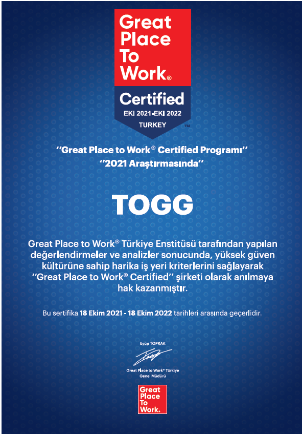 “Great Place to Work araştırmasına stratejik hedeflerimiz dahilinde global bir platformda güçlü ve gelişime açık alanlarımızı kıyaslamalı olarak görmek amacıyla katıldık ama sonuç bundan fazlası oldu. Genç bir şirket olarak araştırmaya katıldığımız ilk yılda bu başarıya ulaşmamız kurum kültürü inşasında doğru yolda olduğumuzu göstermesi açısından da önemli. Biz TOGG’da alışılmadık bir biçimde örgütleniyoruz. Farkımız, çalışanlarımızın uzmanlığına duyduğumuz güvenden kaynaklanıyor. Merkezi olmayan, otonom çalışabilen, mutabakat kültürüne dayalı kararlar alabilen ve kendi kendini organize eden çevik ekipler oluşturuyoruz. Bizim için kararların şekillenmesinde hiyerarşiden çok argümanların gücü önem taşıyor. Çevikliğe engel olabilecek uygulamalara yer vermiyoruz. Bu yüzden klasik hiyerarşik yapı ve unvanlar kullanmıyoruz. Aynı şekilde yetenekleri de belirli görev tanımlarıyla sınırlandırmıyoruz. Herkes, en güçlü olduğu yetkinlik ve çalışma alanlarının yanı sıra bilgisi dahilindeki konularla ilgili çalışma, kendini geliştirme ve resmin bütününü görme fırsatına sahip. Kurduğumuz bu yapının çalışanlarımız tarafından memnuniyetle karşılandığını Great Place to Work Enstitüsü’nden gelen sonuçlarla tescillemiş olduk. Her zaman daha iyiyi hedefleyerek yolumuza devam edeceğiz.”