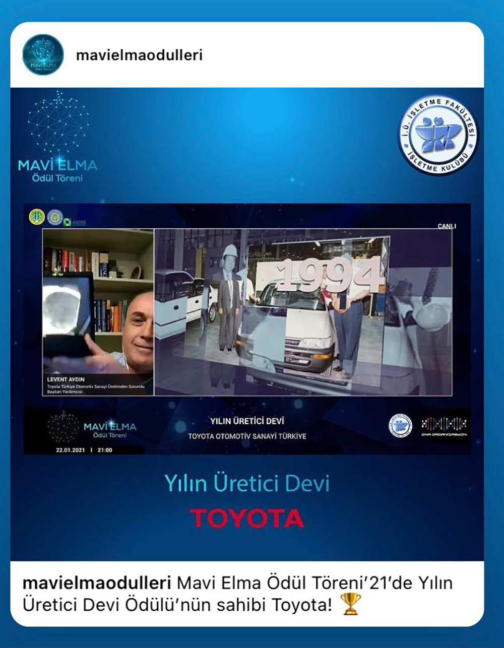 2021 yılında da başarılarını sürdüren Toyota Otomotiv Sanayi Türkiye, İstanbul Üniversitesi İşletme Fakültesi bünyesinde gerçekleştirilen Mavi Elma Ödül Töreni kapsamında ‘‘Yılın Üretici Devi’’ ödülünün sahibi oldu.