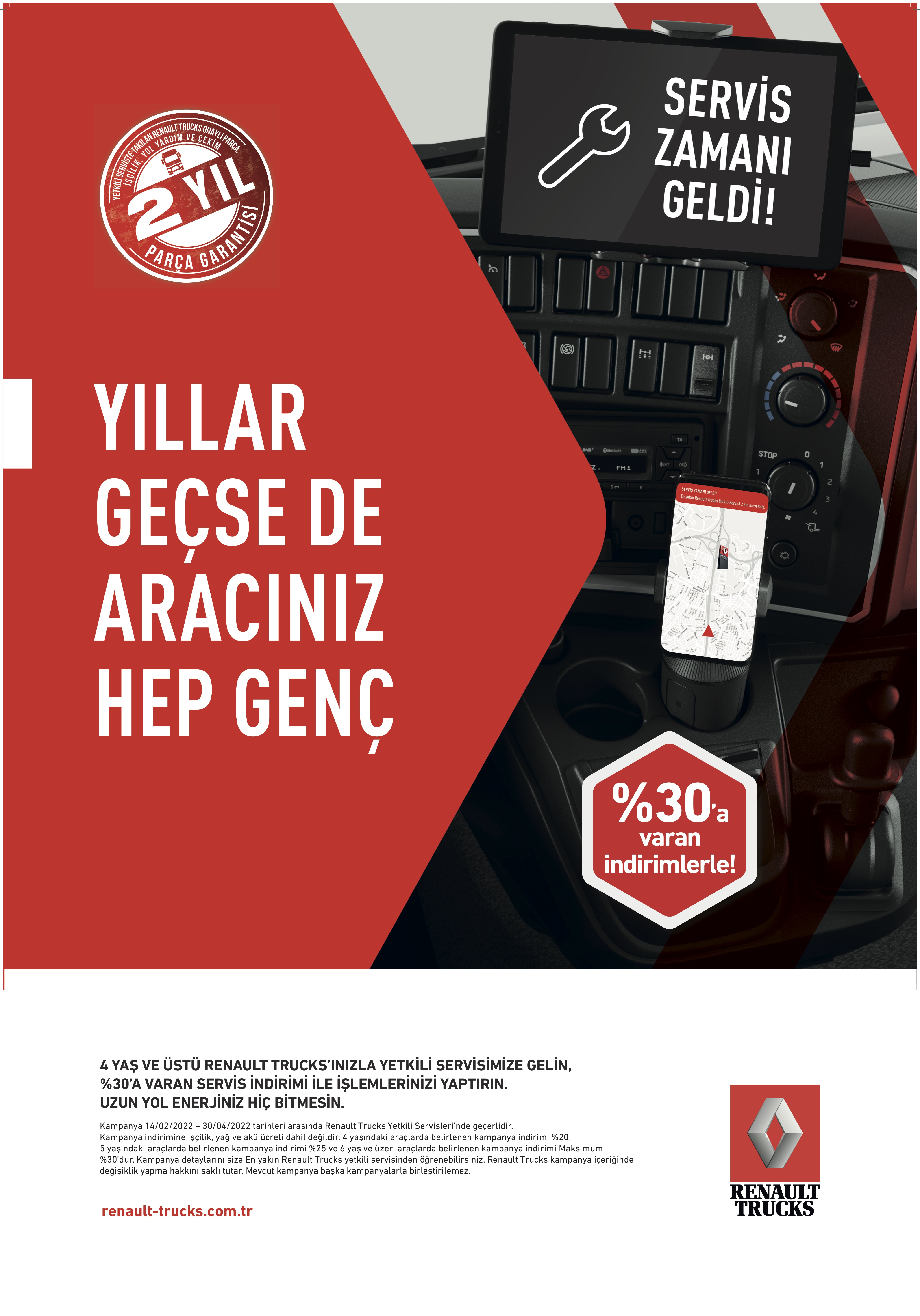 Renault Trucks, 4 yaş ve üstündeki araçları için özel bir kampanya düzenliyor. 30 Nisan 2022’ye kadar devam edecek kampanya kapsamında yüzde 30’a varan servis hizmeti avantajları sunuluyor.