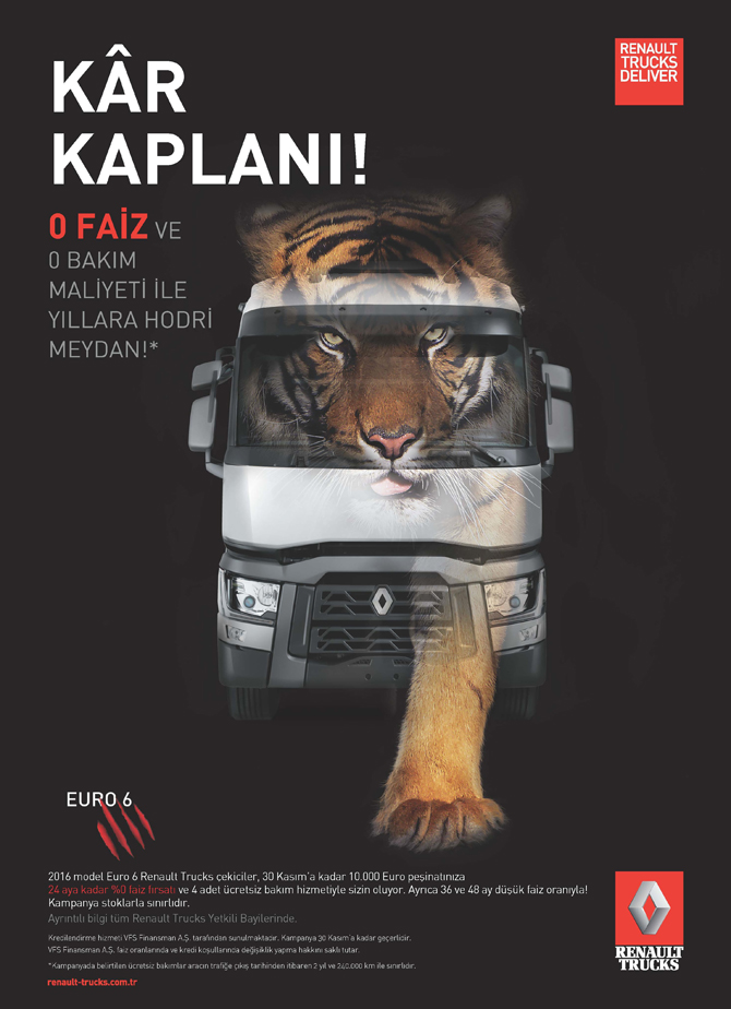 Renault Trucks’ın Kâr Kaplanı kampanyası, 10.000 Euro peşinat ile 24 aya kadar yüzde 0 faiz oranı avantajı sağlıyor. Ayrıca 36 ayda yüzde 0,10 ve 48 ayda yüzde 0,18’den başlayan düşük faiz alternatifleriyle sunulan kampanya kapsamında 70.000 Euro, 75.000 Euro ve 80.000 Euro’luk kredi desteği alınabiliyor. 30 Kasım’a kadar geçerli olan kampanyada aracın trafiğe çıkış tarihinden itibaren 2 yıl boyunca yapılacak dört bakım da hediye ediliyor. Kampanyanın bu avantajları ile birlikte ÖTV indirimi yasası, Renault Trucks Euro 6 çekicileri daha da cazip hale getiriyor.