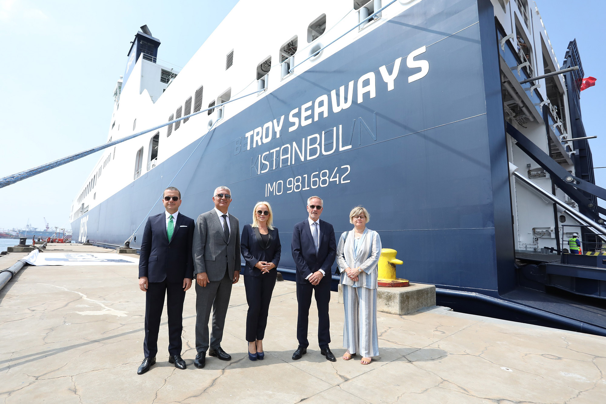 237 metre uzunluğundaki ihtişamlı gemi, DFDS Pendik Limanı’nda gerçekleşen isim verme töreninin ardından, Truva antik kentinden alınan ilhamla “Troy Seaways” adı verilen Ro-Ro gemisi 22 Haziran 2019 tarihinde ilk kez Türk karasularından Avrupa’ya sefer yapacak.