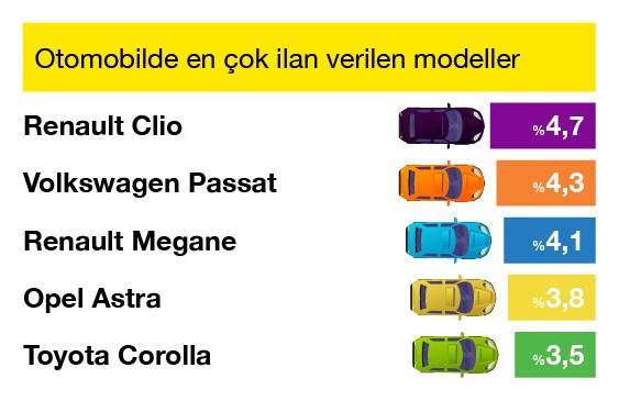 Marka & Model sıralamasında ilk sırayı Renault – Clio aldı. Sıralama, Volkswagen Passat Renault – Megane, Opel - Astra ile devam etti. Toyota – Corolla ise 5. sıradan listeye girdi. En çok ilanı verilen Arazi/ SUV & Pick-up markası değişmedi ve yine Nissan oldu.