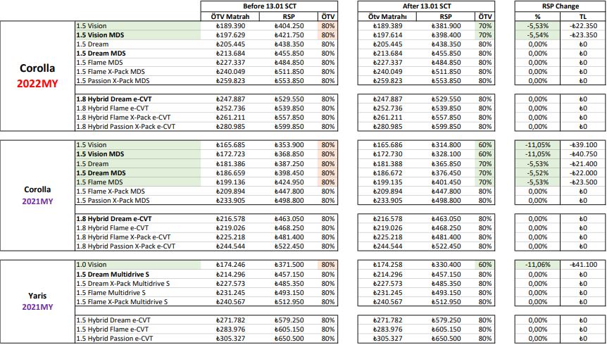 Toyota olarak baktığımızda ise bu düzenlemeden sonra; 2022 model yılı Corolla’nın giriş seviyesi olan 1.5 Vision yüzde 5.5’lik indirimle 22 bin 350 TL, Yaris 1.0 modelimiz ise yüzde 11’lik indirimle 41 bin 100 TL aşağı doğru güncellenerek satışa sunulacaktır.
