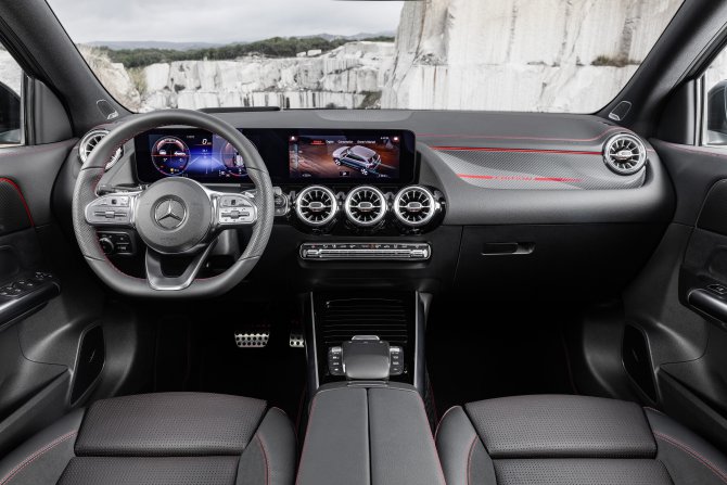 Yeni GLA’da, ön konsol sürücü ve yolcu tarafı görsel olarak oyulmuş temel bir gövdeden oluşuyor. Sürücü tarafını ve orta konsolu geniş ekranlı mimari domine ediyor. Söz konusu ekran: İki adet 7 inçlik (17,78 cm), biri 7 ve diğeri 10,25 inç (26 cm) ve iki adet 10,25 inç olmak üzere üç farklı versiyon olarak sunuluyor.