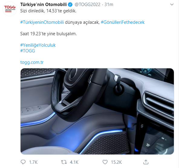 TOGG yerli otomobille ilgili bir diğer paylaşımında, "Sizi dinledik, 14.53'te geldik. #TürkiyeninOtomobili dünyaya açılacak, #GönülleriFethedecek Saat 19.23'te yine buluşalım." dedi.
