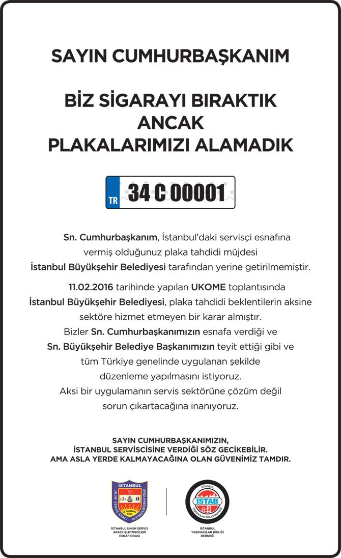 Ayrıca konu ile ilgili olarak, 02 Mart 2016 çarsamba günü saat 11:00 ‘de, Kartal Toplu Ulaşım Hizmetleri Müdürlüğü önünde İSTAB ve İSAROD İstanbul’da plaka tahdidi konusunda alınan kararlarla ilgili 2.basın aciklamasını yapacak.