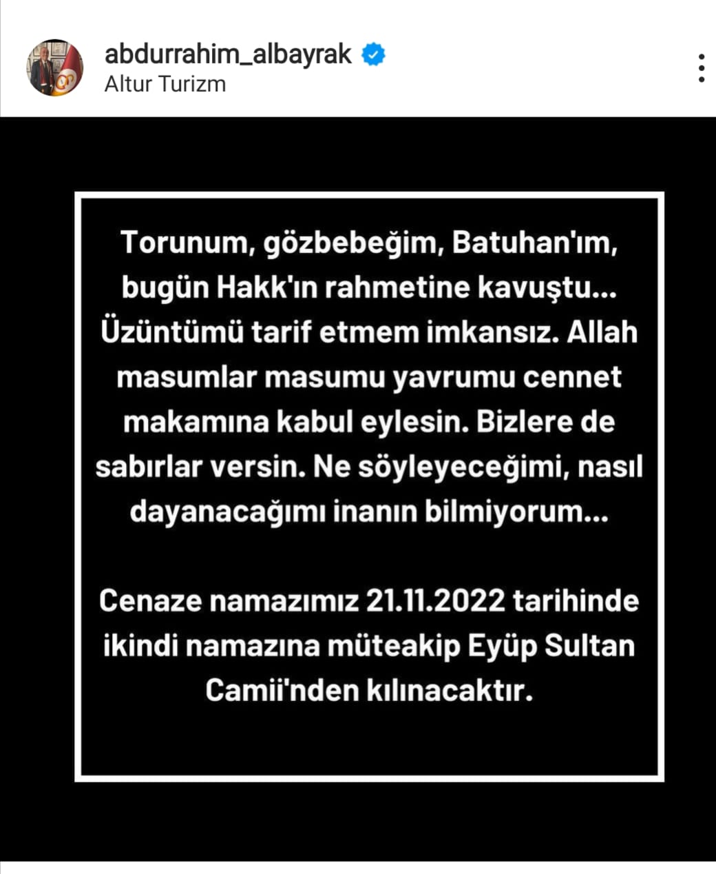 Abdurrahim Albayrak sosyal medya hesabından yaptığı açıklamada "Torunum, gözbebeğim, Batuhan'ım, bugün Hakk'ın rahmetine kavuştu. Üzüntümü tarif etmem imkansız. Allah masumlar masumu yavrumu cennet mekanına kabul eylesin. Bizlere de sabırlar versin. Ne söyleyeceğimi, nasıl dayanacağımı inanın bilmiyorum. Cenaze namazımız 21.11.2022 tarihinde ikindi namazına müteakip Eyüp Sultan Camii'nde kılınacaktır" ifadelerine yer verdi.