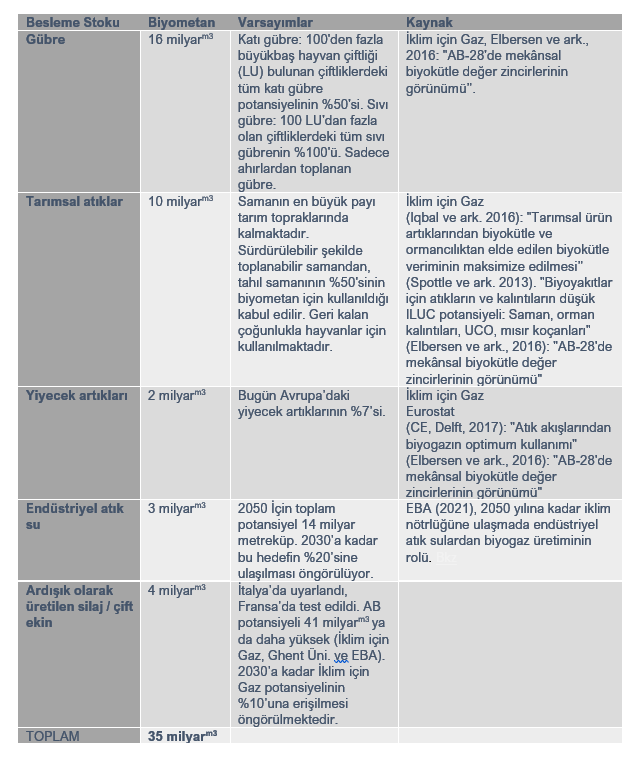 Tablo, AB’nin kendi biyokütle kaynakları aracılığıyla sürdürülebilir bir şekilde 35 milyar metreküp biyometanı nasıl üreteceğini göstermektedir. Bu besleme stoku karışımı, önceki çalışmalar ve endüstriyel atık sular üzerine öngörüler dikkate alınarak hazırlanmıştır. Öngörüler son derece gerçekçidir.