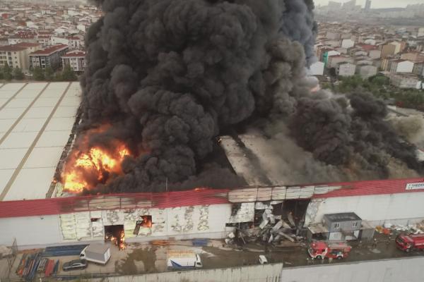Esenyurt'ta antrepoda yangın çıktı. Kısa sürede havayı kaplayan siyah dumanlar kamera ile görüntülendi.