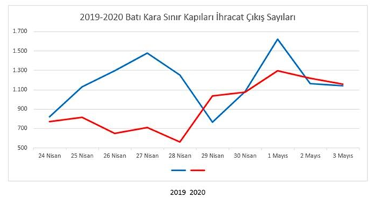 Irak’a 2019 yılı Mart ayında yapılan ihracatımız 2020 yılının aynı döneminde % 40 azalış gösterirken, temassız ticaret uygulamaları ile bu azalış Nisan ayında % 29’a gerilemiştir. Diğer bir ifadeyle, 2020 yılı Mart ayında Irak’a taşımalarımız bir önceki aya oranla % 53 azalırken, 2020 yılı Nisan ayında bu oran % 11’lere kadar düşürülmüştür. Sonuç olarak, temassız ticaret uygulamaları ile içinde bulunulan pandemi günlerinde de Ticaret Bakanlığımızın hedeflediği günlük 1500-1700 çıkış sayısına ulaşılmıştır.