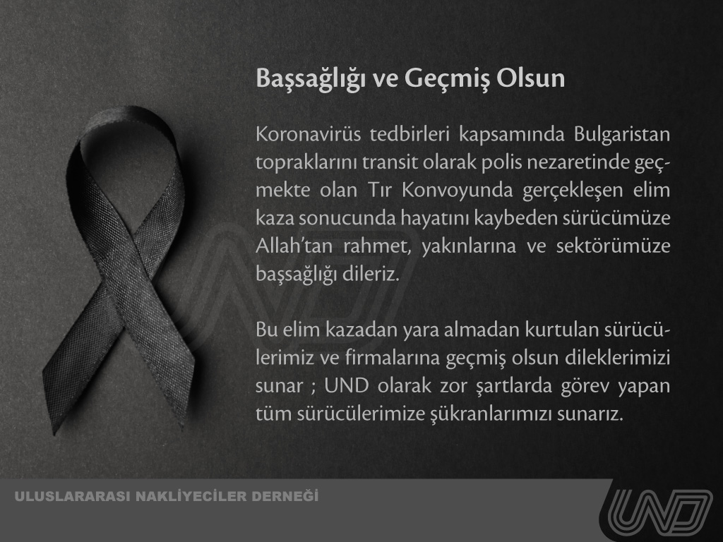 UND: "Koronavirüs tedbirleri kapsamında Bulgaristan topraklarını transit olarak polis nezaretinde geçmekte olan Tır Konvoyunda gerçekleşen elim kaza sonucunda hayatını kaybeden sürücümüze Allah’tan rahmet, yakınlarına ve sektörümüze başsağlığı dileriz. Bu elim kazadan yara almadan kurtulan sürücülerimiz ve firmalarına geçmiş olsun dileklerimizi sunar ; UND olarak zor şartlarda görev yapan tüm sürücülerimize şükranlarımızı sunarız."