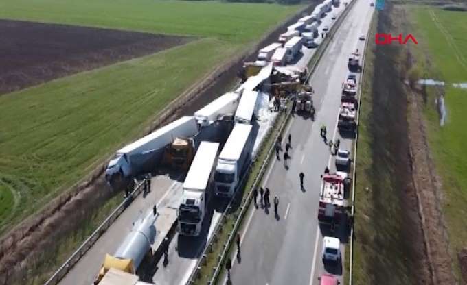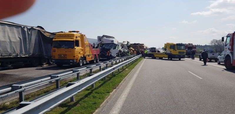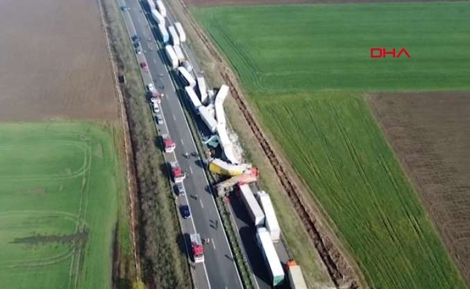 Corona virüs salgınına ilişkin alınan önlemler kapsamında oluşan Kapitan Andreevo Sınır Kapısı’ndaki TIR yoğunluğunu azaltmak amacıyla bir hafta önce faaliyete geçen ‘Uzuncovo’ eski askeri havaalanındaki tampon TIR parkından, polis eşliğinde Kapıkule’ye gitmek üzere yola çıkan konvoydaki 22 TIR ve bir polis aracı birbirine girdi.
