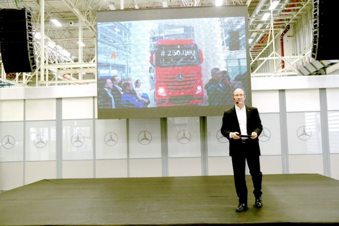 Katılımcıların şahitliğinde 250.000’inci üretim olan Mercedes-Benz kamyon, Actros 1853 LS 4x2 modeli İtalya’ya ihraç edilmek üzere banttan indi ve yola çıktı. 2017 yılında kamyon ihracatını bir önceki yıla oranla yüzde 38 oranında artıran fabrika, önümüzdeki yıllarda ihracatını daha da artırmayı hedefliyor.
