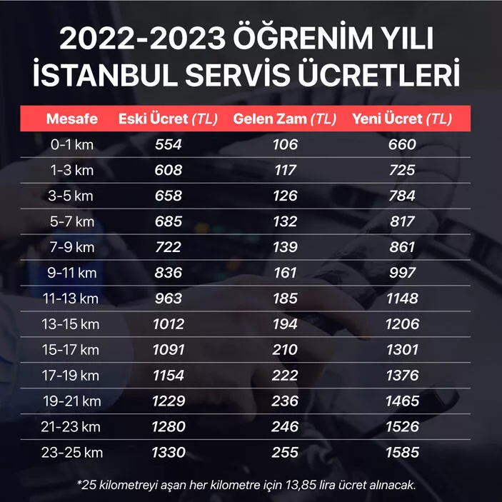 İstanbul'da Okul Servisi ücretleri belli oldu. UKOME toplantısında servis ücretlerine 19.21 zam yapılmasına karar verildi. Yapılan zamla birlikte en kısa mesafe olan 0-1 kilometre 660 lira, en uzak mesafe olan 23-25 kilometre ise 1585 lira oldu. En uzun mesafe olan 25 kilometreyi aşan her kilometre için 13,85 lira Ücret alınacak.