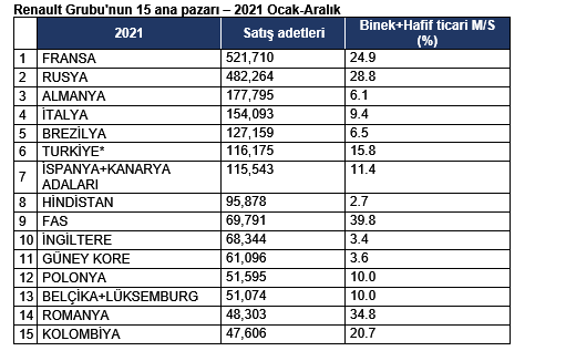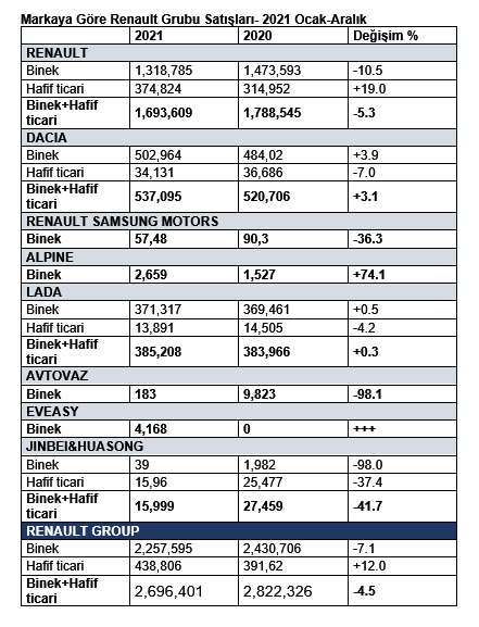 Grubun Avrupa'daki siparişleri, 2020 yılına kıyasla iki katına çıktı ve Renault E-TECH ürün gamının, hafif ticari araçlar, Dacia Sandero ve Dacia Spring %100 elektrikli gibi modellerin ilgi görmesinin de etkisiyle stoklar ise 2020 yılına kıyasla yaklaşık %30'luk bir düşüş kaydetti.