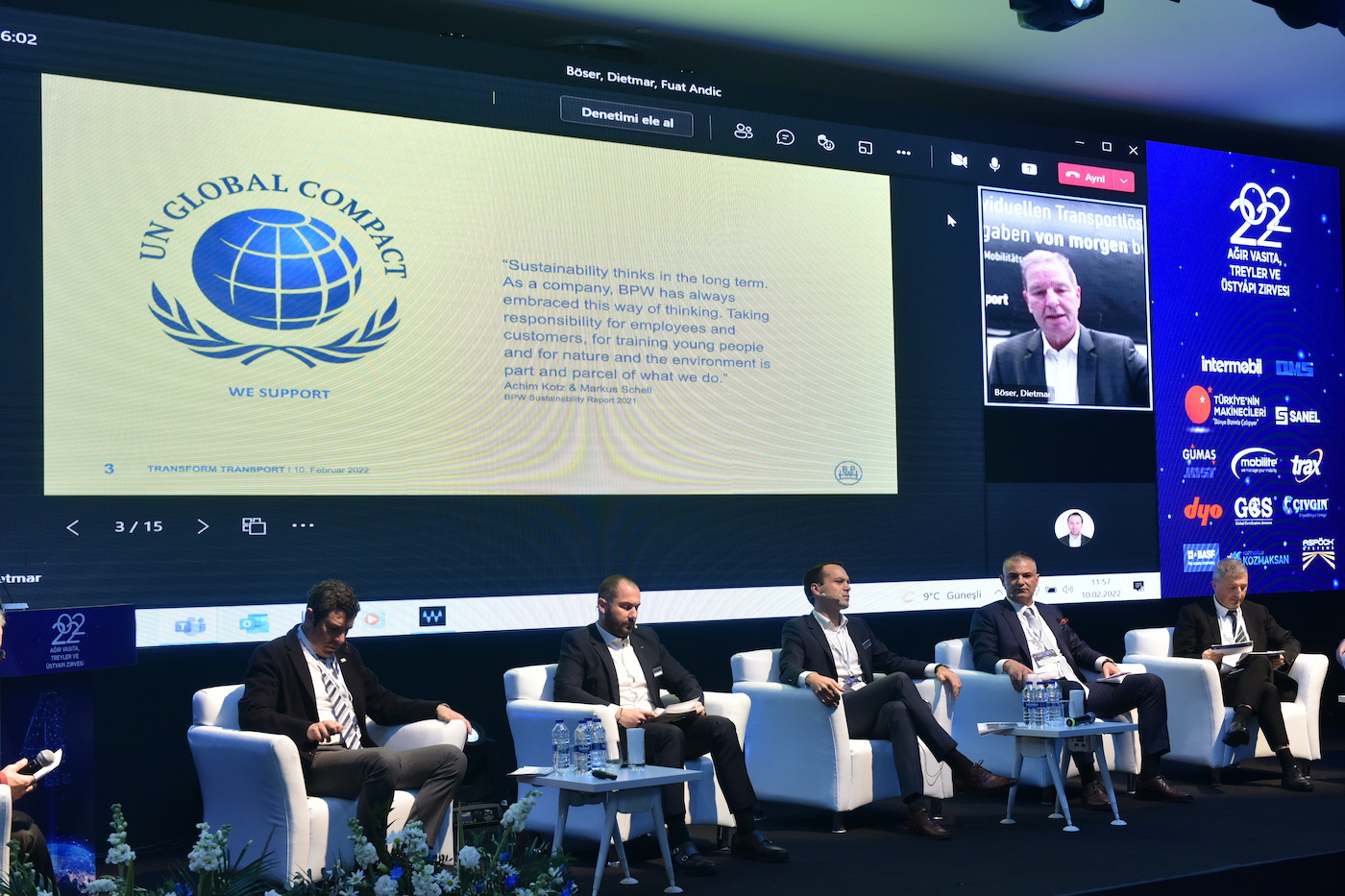 Kassbohrer Yönetim Kurulu Üyesi İffet Türken, sürdürülebilirliğin dünyada en önemli konu haline geldiğini belirterek, yük taşımacılığının Avrupa'da 2040 yılına kadar yüzde 45 artacağını bunun için adımların şimdiden atılmaya başlandığını anlattı. Yeni araç kombinasyonları ve yeni mevzuatları gerekli kılan gelişmelerin ortaya çıktığını aktaran Türken, “Emisyon şartlarını biz memnuniyetle karşılıyoruz. Ar-Ge’mizi ön plana çıkarıyoruz. Geniş bir inovasyon ekosisteminde müşterilerimizle, tedarikçilerimizle, üniversitelerle iş birliği içinde çalışmalıyız. İntermordal dediğimiz taşımalar ön plana çıkıyor, daha uzun araçlar gelişiyor. Bu gelişmeleri destekliyoruz, akıllı teknolojileri yatırım yapılması gerektiğine inanıyoruz. Avrupa İnovasyon Ödüllerinde 2021 yılında 3 ketagoride ödül kazandık.” diye konuştu.
