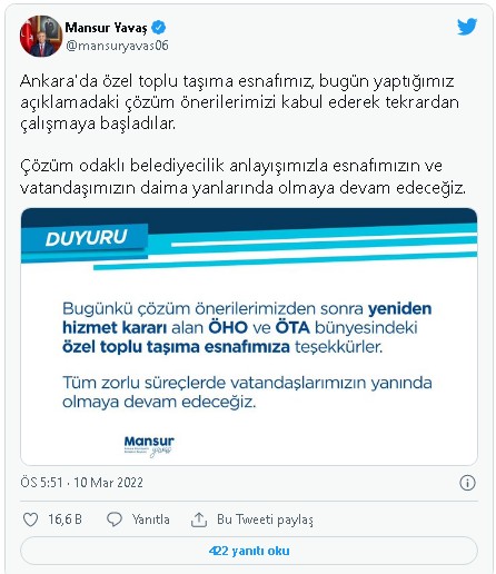 Ankara Büyükşehir Belediyesi önünde toplanan otobüs ve dolmuş şoförleri akaryakıt zamları nedeniyle toplu taşıma ücretlerine en az '10 TL” zam yapılmasını isteyerek kontak kapatmıştı. Mansur Yavaş, anlaşmazlığın çözüme kavuşturulduğunu duyurdu.