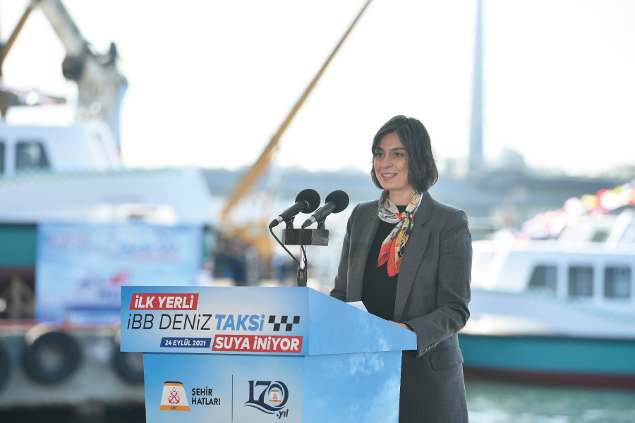 Şehir Hatları Genel Müdürü Sinem Dedetaş konuşmasında, Deniz Taksi sürecinde yaptıkları çalışmaları tüm detaylarıyla anlattı. Çalışmalara, Şehir Hatları’nın 170. kuruluş yıldönümünde başladıklarını aktaran Dedetaş, “1455’ten bu yana nice kadırga, kalyon, buharlı yolcu gemileri, arabalı vapur, hala seferde olan vapurlarımız gibi pek çok ilk üretimi gerçekleştirmiş olan Haliç Tersanemizde, bugün bir ilki daha gerçekleştirmiş olmanın mutluluğunu yaşıyoruz. Bugün 8 adedini denize indirdiğimiz deniz taksilerimiz yıl sonunda 45, 2022 ilk çeyreğinde ise 50 sayısına ulaşacak” dedi.