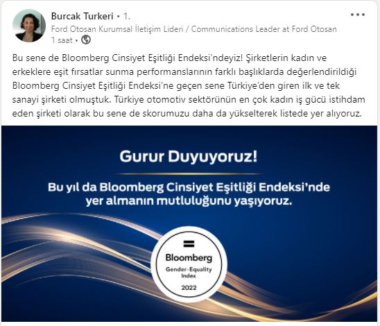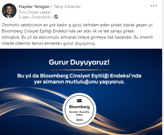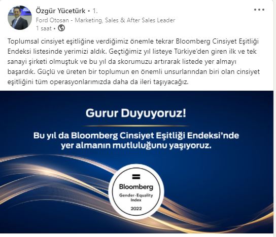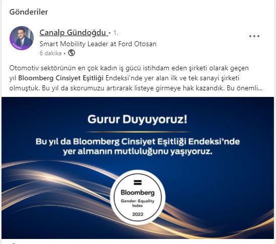 Ford Otosan, sektörel, uluslararası ve Türkiye ortalamalarının üstünde bir performans sergileyerek 2022 Bloomberg Cinsiyet Eşitliği Endeksi'nde bu senede yer almayı başardı. Ford Otosan yöneticileri bu başarıyı sosyal medya hesaplarından duyurdu.