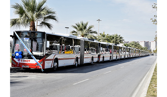 İzmir Büyükşehir Belediyesi ESHOT Genel Müdürlüğü'nün OTOKAR firmasından aldığı 100 adet körüklü otobüsten 60'ı törenle hizmete girdi