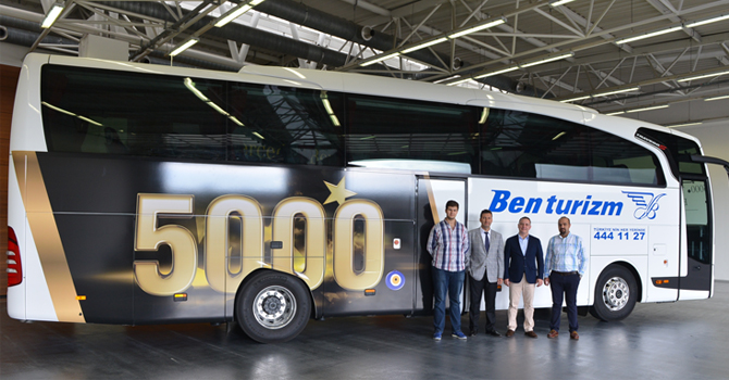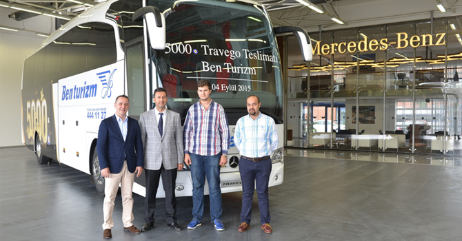 Mercedes-Benz Türk Otobüs Filo Satış Kısım Müdürü Burak Batumlu tören sırasında yaptığı konuşmada; “Bugün burada, çok değerli müşterimiz Ben Turizm’e 21 adet Travego 15 S aracımızın teslimatını yapmak için toplandık. 2015 yılının ilk çeyreğinde 18 adet Travego 15 S ve yine 2015 yılının üçüncü çeyreğinde 21 adet Travego 15 S olmak üzere bu yıl toplam 39 adet Travego 15 S yatırımı gerçekleştiren müşterimize teslim edeceğimiz araçların içerisinde, Mercedes-Benz Türk Hoşdere Otobüs Fabrikası’nda üretilen 5.000’inci Travego otobüsümüz de bulunmakta. Bu vesile ile 5.000’inci Travego aracımızın kendilerine teslimatını yapmanın haklı gururunu hep birlikte yaşıyoruz. Bu vesile ile müşterimize araç yatırımlarında markamızı tercih ettiği için teşekkür ederiz. Bu araçların Ben Turizm’e hayırlı olmasını, bol kazançlar getirmesini, kendileriyle uzun yıllara ve karşılıklı güvene dayalı işbirliğimizin devamını dileriz.’’ dedi.