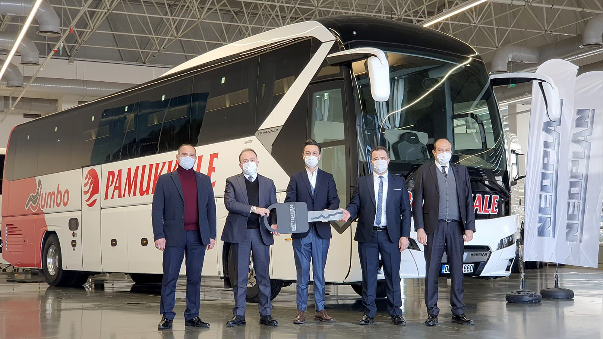 Ekstra yüksek yolculuk konforu, mükemmel iç ve dış tasarımının yanı sıra benzersiz ekonomik kazanımlar ve yüksek güvenlik özellikleri ile seyahat otobüsleri için standartları yeniden belirleyen NEOPLAN Tourliner’ın teslimatı Türkiye’nin en köklü ulaşım markalarından Pamukkale Turizm’in bireysel yatırımcısı Metin Yer Hizmetleri Şirketi’ne yapıldı. Yolcularına eşsiz bir seyahat keyfi yaşatmak isteyen firma, Pamukkale Turizm’in VIP hizmet sunan Jumbo hattında kullanılmak üzere filosuna 1 adet 13 metre, 2+1 koltuk düzenli NEOPLAN Tourliner kattı. Ankara Akyurt’taki MAN Tesislerinde, MAN Kamyon ve Otobüs Tic. A.Ş. Otobüs Satış Bölge Yöneticisi Emrah Albustanoğlu ev sahipliğinde yapılan teslimat törenine Metin Yer Hizmetleri sahibi Metin Kutucu, Pamukkale Turizm Bölge Koordinatörü Ufuk Bababalım, Ankara Otogar Müdürü Hakan Cimbiş ve Metin Yer Hizmetleri yetkilisi Cenk Karayılmaz katıldı.