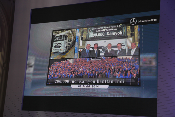 Merdeces-Benz Türk Pazarlama ve Satış Direktörü Süer Sülün: “Kamyon ihracatında düşüşümüz var ama satış ve üretimi karşılaştırınca sebebi ortaya çıkıyor.18.500 kamyon ürettik Aksaray’da bu tarihimizin en büyük üretim adedi oldu.Öncelikli pazarımız Türkiye olduğu için ihracat azaldı.Türkiye’de üretilen 3 kamyondan 2’si bizim 2 otobüsten biride bizim üretimimiz.Burada Pazar büyüklüğü önemli,bugüne kadar arz talep dengesini yakaladık.Şu an ki üretim kapasitesi ülkemiz için yeterli,ihracat için yatırımlarımız devam ediyor.203.000 bin adet kamyon ürettik ve 31.000 adedi ihraç edildi yaklaşık yüzde 15’lik bir ihracat payına sahibiz” dedi.